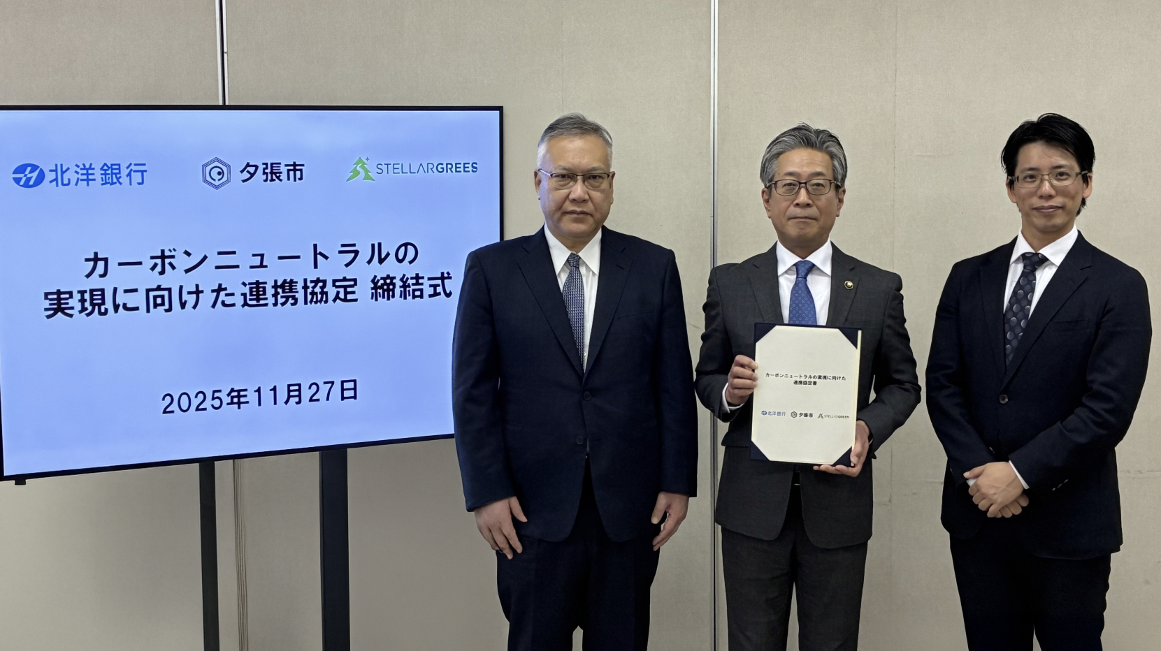 森林カーボンクレジット創出の支援事業を展開する株式会社ステラーグリーン(本社:東京都中央区、代表取締役社長 兼 CEO:中村 彰徳、以下「ステラーグリーン」)と、提携先である株式会社北洋銀行(本店:北海道札幌市、取締役頭取:津山 博恒、以下「北洋銀行」)は、2025年11月27日(木)に北海道夕張市(市長:厚谷 司、以下「夕張市」)と 3者間連携協定を締結しました。