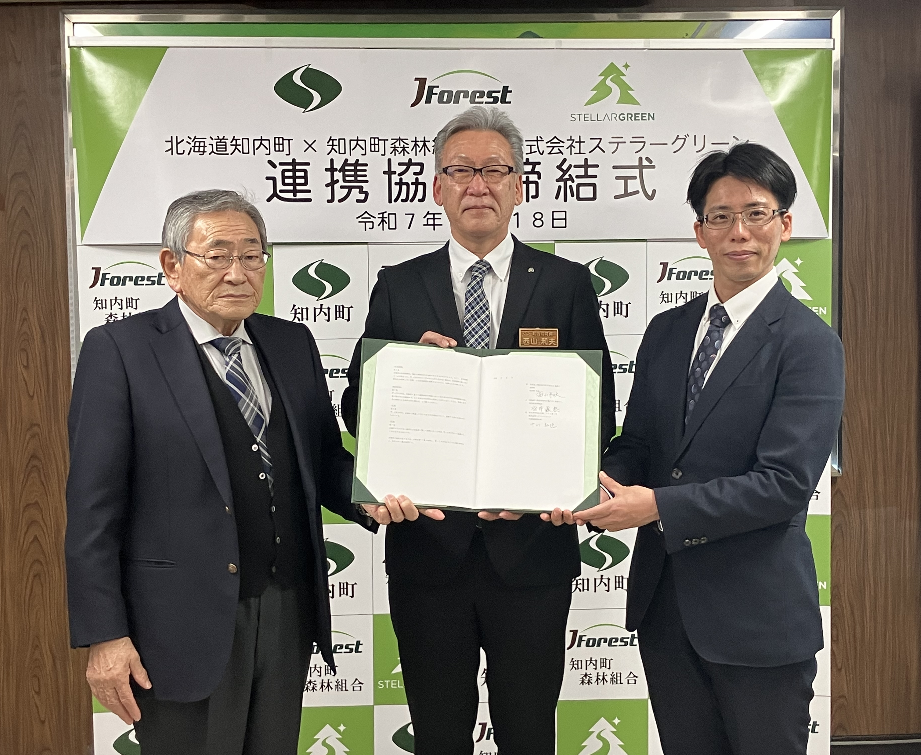 知内町は、豊かな森林資源と美しい海岸線を擁し、四季折々に多彩な表情を見せる自然環境のもと、基幹産業の第一次産業を中心に、自然の恵みを享受しつつ発展を遂げてまいりました。このたび、地域の森林管理主体である知内町森林組合および株式会社ステラーグリーンと本町との3者による連携協定の締結は、当地の貴重な自然環境を最大限に活かした意義深い取り組みであり、森林資源を活用した新たな事業の幕開けとなるものであります。