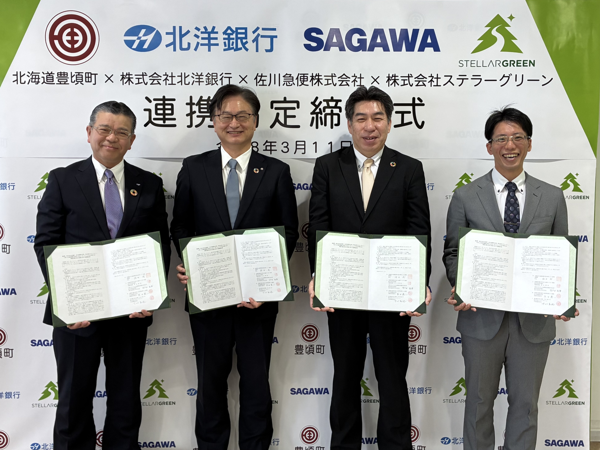 森林カーボンクレジット創出の支援事業を展開する株式会社ステラーグリーン(本社:東京都中央区、代表取締役社長 兼 CEO:中村 彰徳、以下「ステラーグリーン」)と株式会社北洋銀行(本店:北海道札幌市、取締役頭取:津山 博恒、以下「北洋銀行」)、SGホールディングスグループの佐川急便株式会社(本社:京都府京都市南区、代表取締役社長:笹森 公彰、以下「佐川急便」)は、2026年3月11日(水)に、北海道豊頃町(町長:按田 武、以下「豊頃町」)における、森林資源の活用によるカーボンニュートラルの実現および持続可能な社会の実現に向けた連携協定を締結しました。